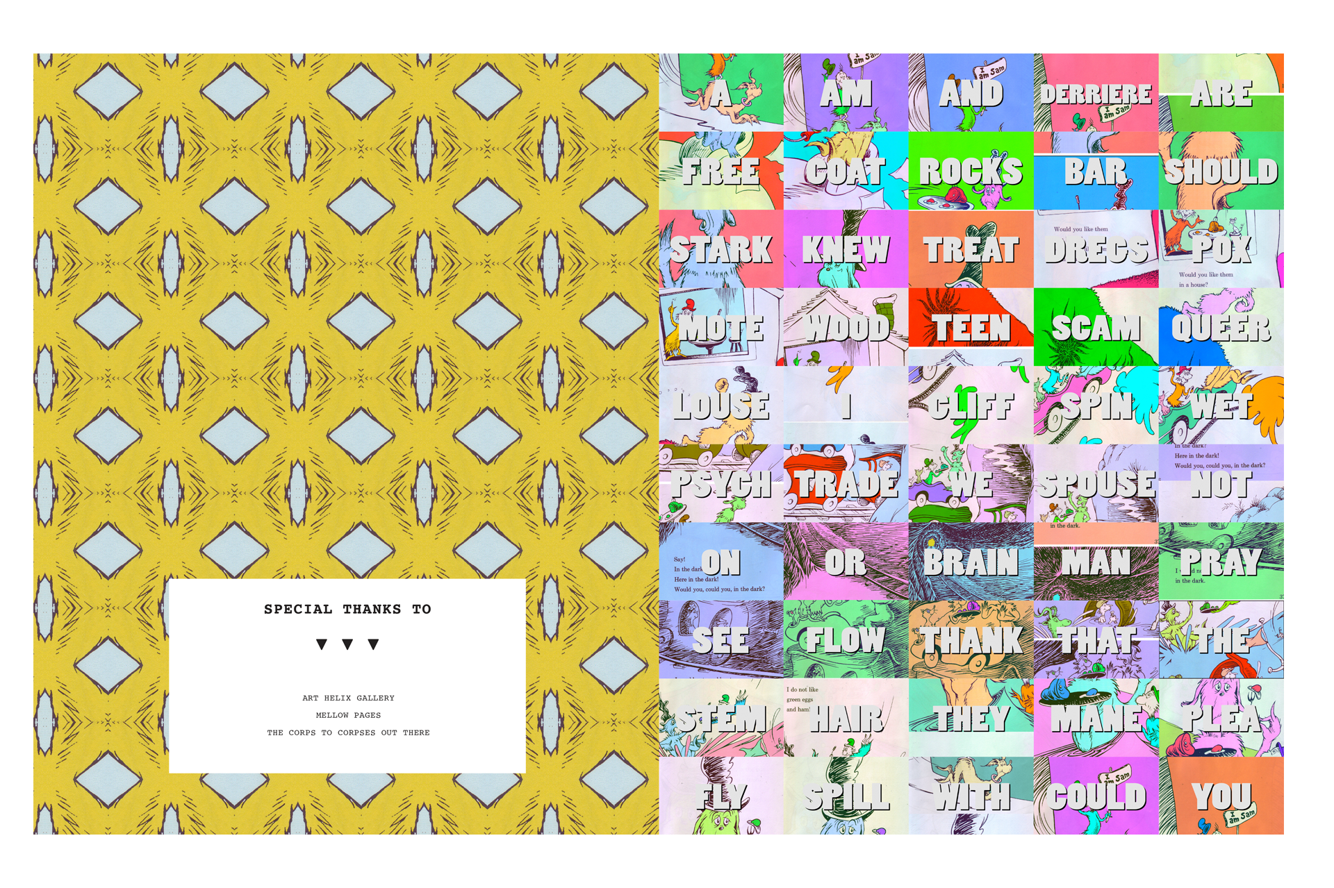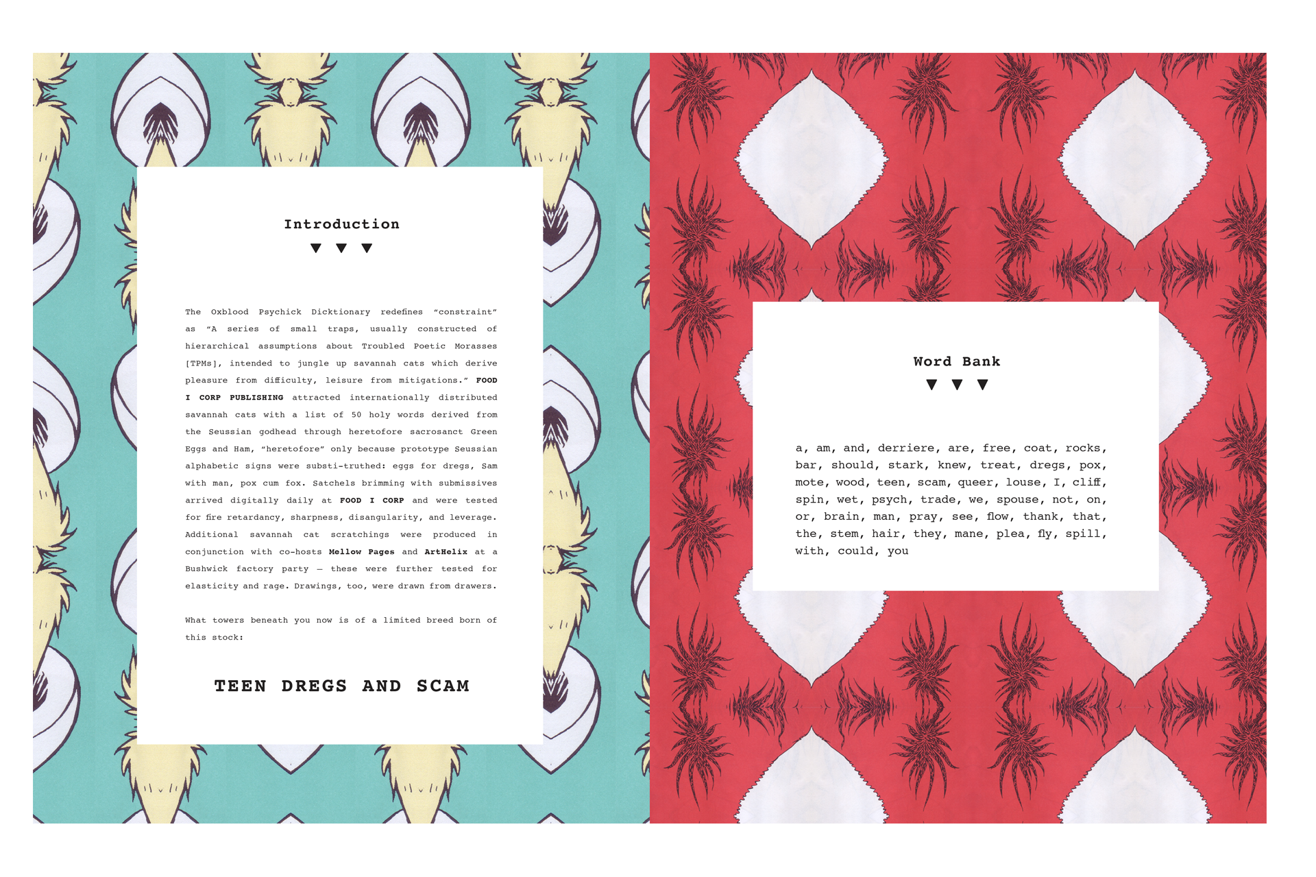I designed and bound Teen Dregs for FoodICorp Publishing, poetry curated by Brandon Johnson and Phil Shaw based on Dr, Seuss’s Green Eggs and Ham. The project was combined with an interactive event in collaboration with Mellow Pages Library hosted by ArtHelix gallery. Images and video collateral created for for the event was used in the creation of the final book.